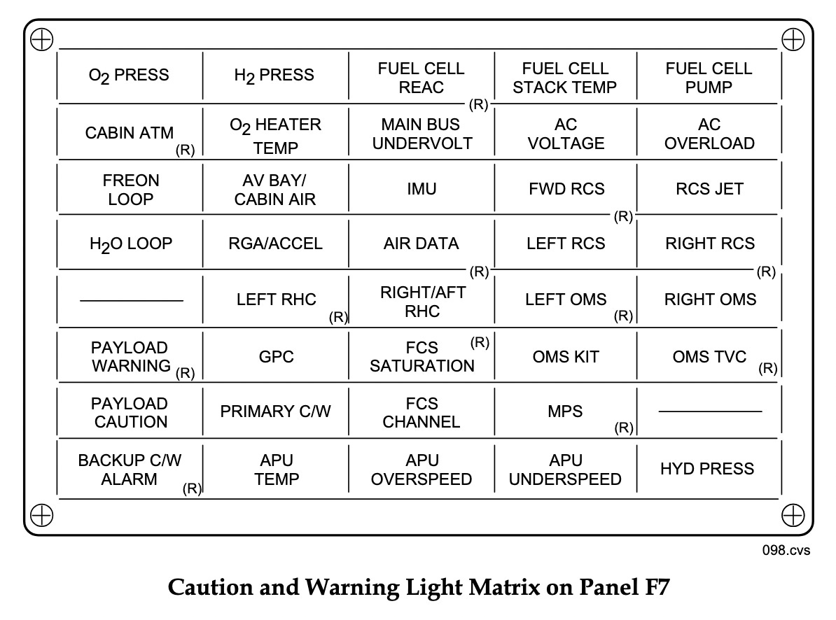 The OMS kit warning light would go on for the following reason: “OMS KIT (Y): Indicates detection of an OMS kit oxidizer or fuel tank ullage pressure out of limits. The hardware channels are 77 and 87 for oxidizer and fuel respectively.”