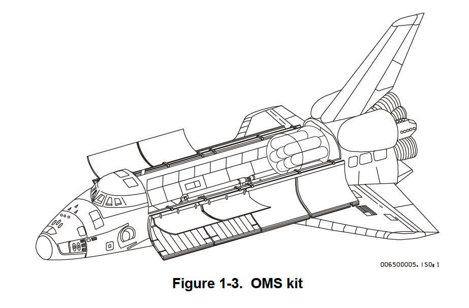 Here’s what the OMS kit itself would’ve looked like. The additional propellant would’ve been stored in the aft end of the payload bay. (Essentially the same place where the Extended Duration Orbiter pallet goes.)